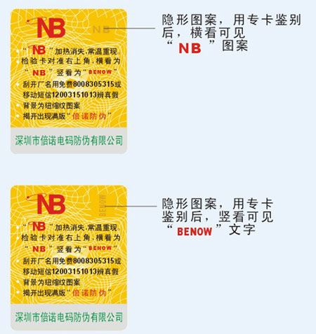 此种标识适用于多种产品应用,标签表面解码区印刷有模拟条形码或客户要求的隐藏信息,此种信息在不使用仪器而目测时无法识别,须由专用解码器辨认,解码器只能与同一批次解码标签配套使用。也称双卡径迹防伪。