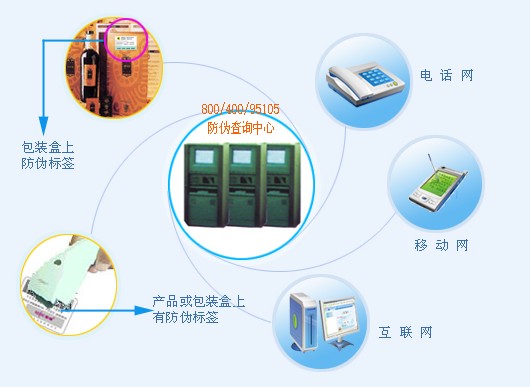 电码防伪标识物:产品防伪密码的载体,是隐含防伪密码的特殊印刷标识。信息中心-智能识别系统:其中信息中心承担产品密码的核对验证和接收处理;公共通讯网完成产品密 码数据及语音内容的传输,使消费者通过电话(互联网或手机短消息)能够 查询获知产品真伪。