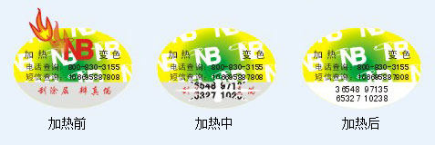 不可逆行油墨:温度变化使标识的图案颜色发生变化。使用这种油墨技术印刷的图案,在加热到一定温度,如热水杯、香烟、打火机等方式加热后可使图案文字变化,当热源散去,图案文字不还原,鉴别方法简单。