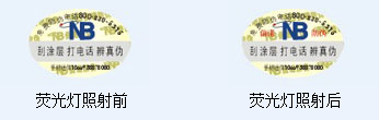 此种标识属于特种纸张及特殊油墨防伪工艺。在造纸过程中加入特殊荧光纤维成份,使其不均匀的分布。这种荧光纤维分为有色荧光和无色荧光,一般在无色荧光纤维纸上印刷图文信息。可通过荧光灯照射鉴别真伪。