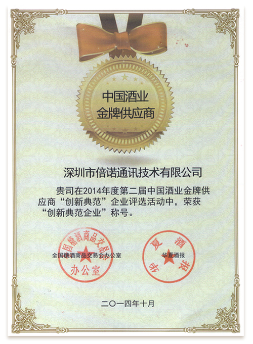 倍诺科技荣获2014年度第二届中国酒业金牌供应商称号。