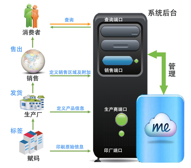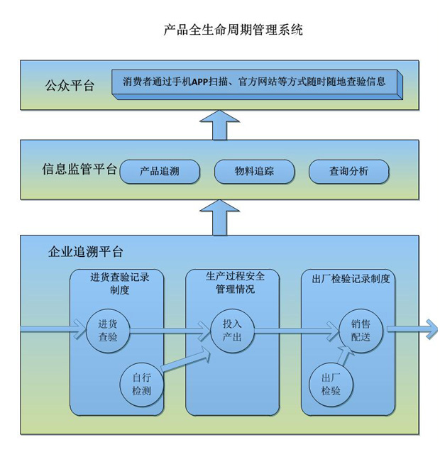 《产品全生命周期管理系统》通过移动终端、信息载体(一维、二维条码或RFID电子标签),借助于信息化的管理手段和自动识别技术,在进货验收、生产装配、出厂检验、销售流通、回收召回等关键环节进行信息采集上传,形成环环相扣的动态数据链,实现从原辅料到成品的跟踪、从成品到原辅料的溯源,为品牌企业建立一整套产品质量安全保障体系,形成来源可追溯、去向可查证、责任可追究的安全责任链。